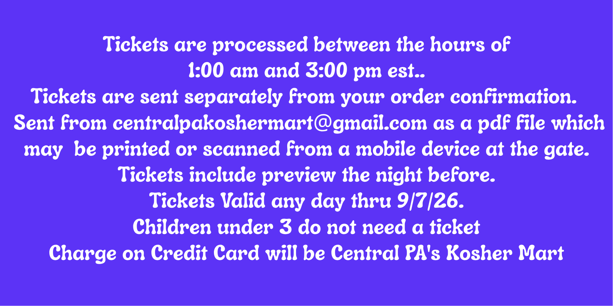 Tickets are processed between 1:00 am -3:00 pm est. Tickets are sent to your email as a PDF File. Charge on Credit Card will be Central PA's Kosher Mart.
